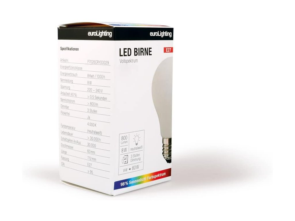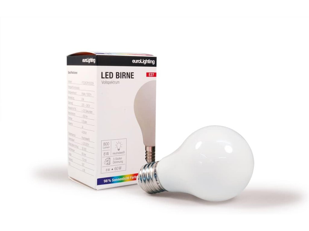 LED žárovka s paticí E27 s náhradní teplotou chromatičnosti (CCT) 4000 K a s vysokým indexem podání barev CRI 97 vhodná na aktivitu přes den do vašich stávajících svítidel (stropních a závěsných) se třemi kroky intenzity ovládané vypínačem.