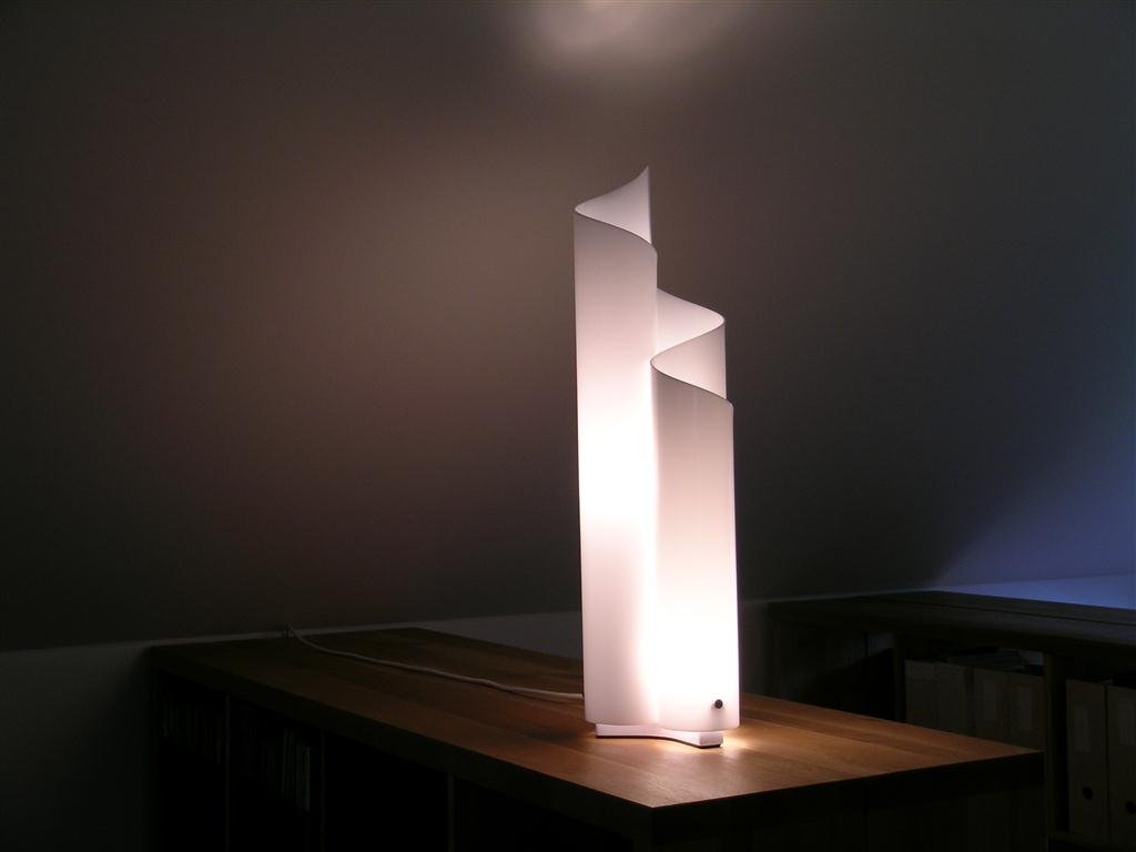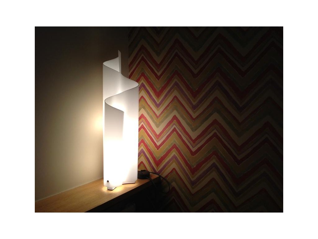 Base in white painted metal; structure/diffuser in heat-curved white opal methacrylate. Diffused and filtered light emission.