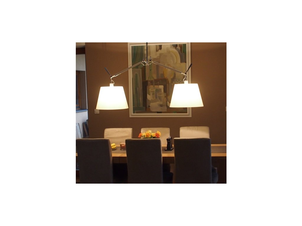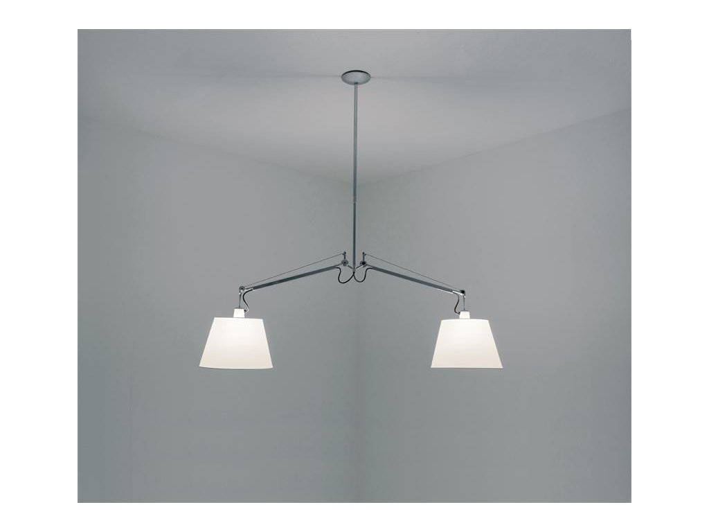 Ceiling light with polished aluminum arms. Based on the spring balancing system. Parchment or silvery satin, both versions in four sizes. Performable lighting.