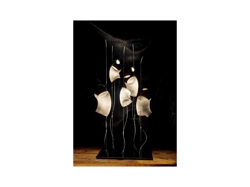 Paper, metal, silicone, glass, aluminium, adjustable mirror. 230 volts: two electronic transformers, separately dimmable. Position of lighting elements is variable.