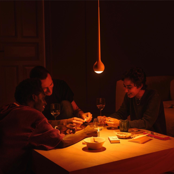 Falling Sun je elegantní závěsné svítidlo v několika barevných variantách svítící měkkým teple bílým až oranžovým světlem bez modré a zelené složky s náhradní teplotou chromatičnosti (CCT) od 1300 K do 2700 K a vysokou věrností podání barev (CRI > 90).