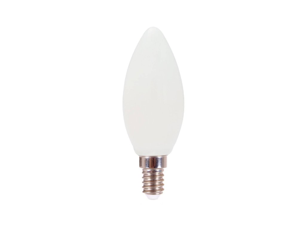 Mléčná LED žárovka ve tvaru svíčky s paticí E14 a širokým vyzařováním světla.