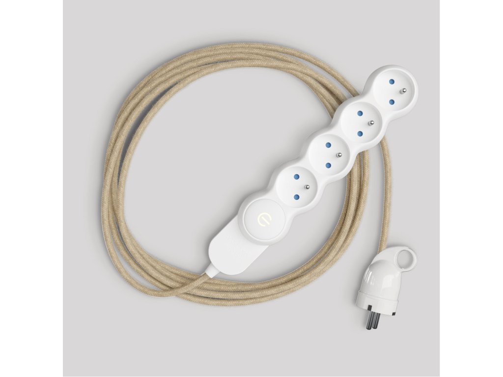 Francouzská multizásuvka s jutovým kabelem neutrální barvy a zástrčkou Schuko s komfortním kroužkem