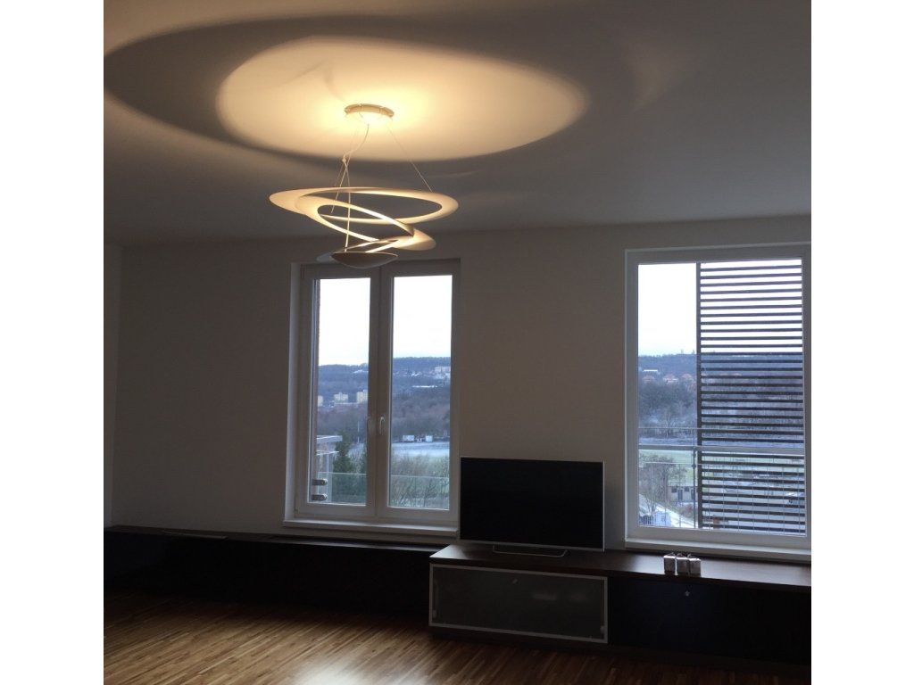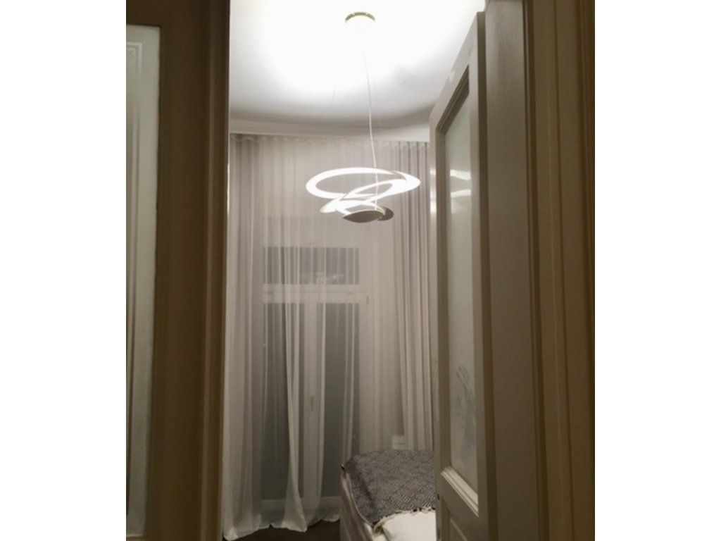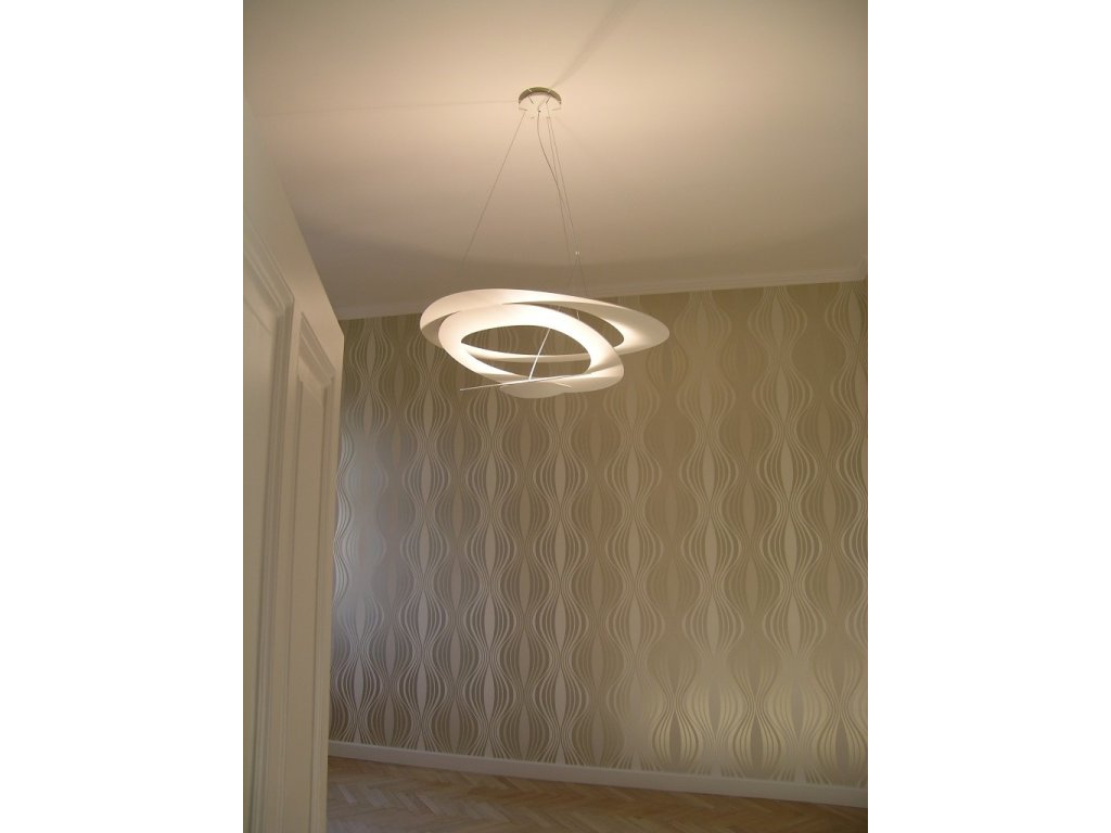 Závěsné svítidlo. Z kovového tenkého disku se postupně rozevírají spirály lehce padající k zemi a vytvářejí magický efekt hry světla a stínu.